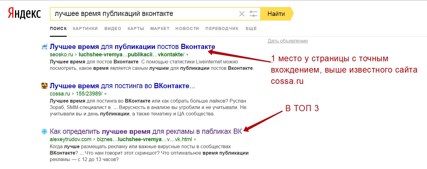 Даже если забыть о влиянии точного вхождения на ранжирование, соответствие сниппета запросу влияет на кликабельность в выдаче. Ведь пользователь будет понимать, что здесь он найдет именно то, что искал.
