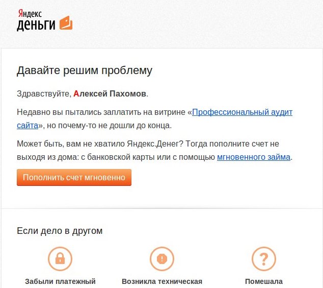 Яндекс также помогает продавать тем, кто побывал на странице платежа, но так и не решился оплатить покупку. Присылает пользователям Яндекс.Денег вот такое уведомление: