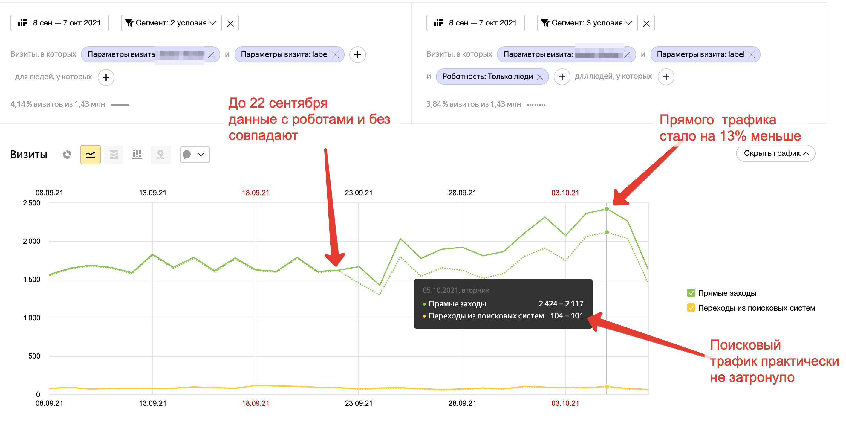 - 22 сентября в Метрике действительно появился более эффективный механизм определения роботов. Это точно шаг в правильном направлении, что радует.